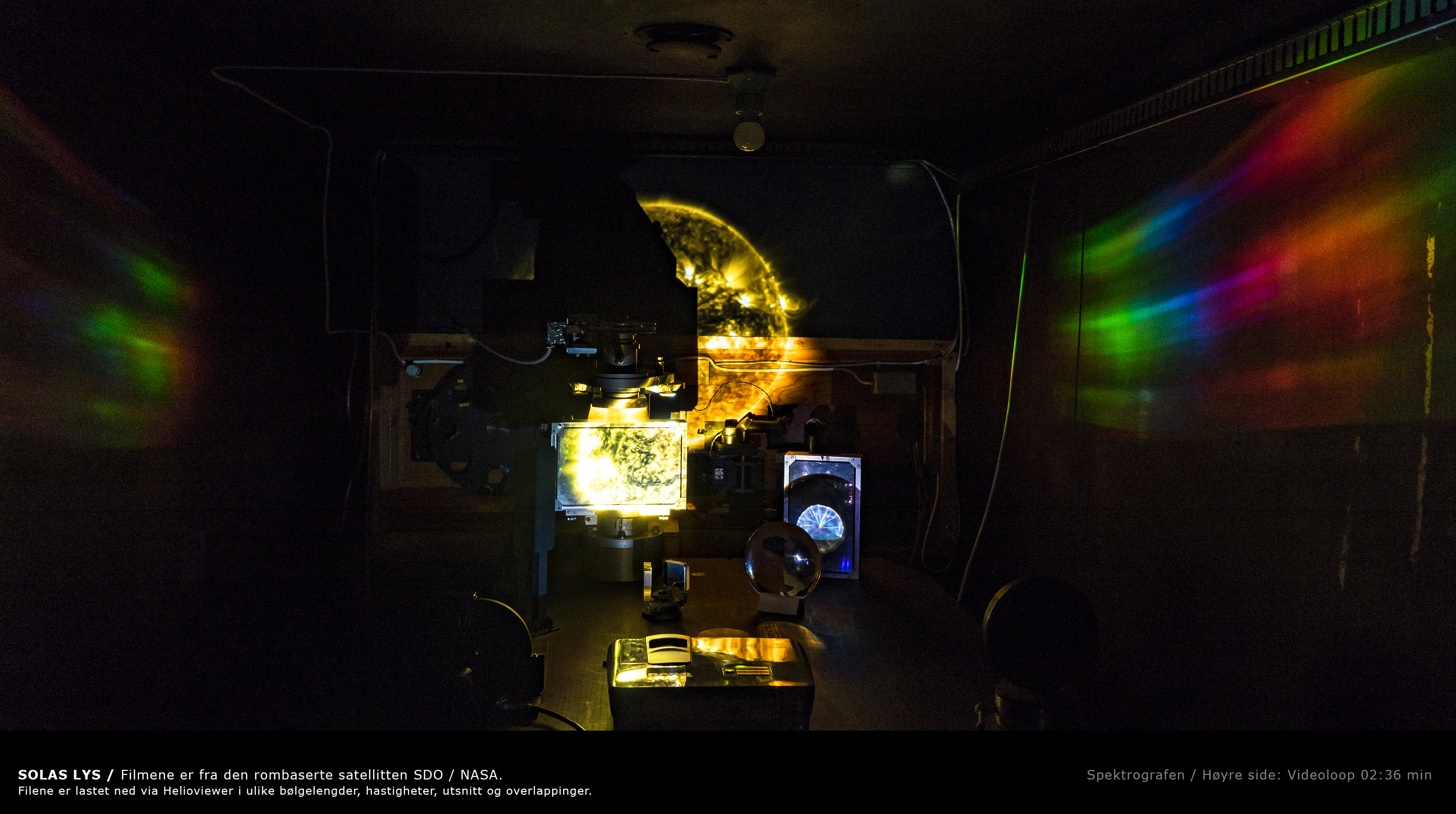 Installasjonen består blant annet av lys og videoprojisering av solobservasjoner, glassobjekter som både spalter, samler og reflekterer lyset som projiseres. Speilene er fast inventar i spektrografen. Glassobjektene er fra min egen samling.